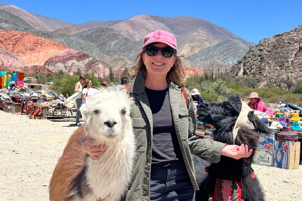 Ya sobre el final del viaje, despaché cuatro cajas de productos desde Purmamarca, y con dos maletas repletas, volví feliz a Buenos Aires. Tengo presente cada momento compartido con las familias de artesanos y aún siento la suavidad de las llamas que pude acariciar al costado de la ruta, cuando su dueña las llevaba de regreso al corral para comer a la sombra. Pude traer de recuerdo una foto que comparto con ustedes en este blog.